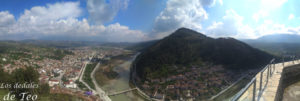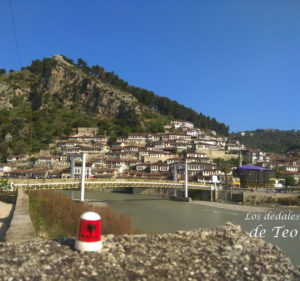 Hora y media después y tras atravesar otro puerto de montaña, en el que en algún tramo vemos que la mitad de la carretera había desaparecido literalmente ladera abajo, comenzamos a ver las señalizaciones que indican la llegada a Berat. Nos sorprende ver pozos petrolíferos a los lados de la carretera, similares a lo que hay en la comarca de las Loras en Burgos, y es que por lo visto existen yacimientos de petróleo por esa zona. La ciudad de los mil ojos, como se la conoce, está dividida en 3 barrios , Kajala o barrio del castillo en lo alto, Mangalem o barrio históricamente musulmán, cuyas ventanas parecen observarnos dando el sobrenombre a la localidad, y Gorica o barrio cristiano ortodoxo, al otro lado del río Osum pero unido por un hermoso puente peatonal. Todos ellos la confieren la categoría de Patrimonio de la Humanidad