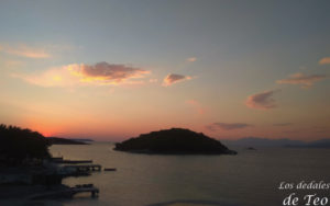 Faltaba todavía un rato para el atardecer mientras atravesábamos las dos localidades más turísticas de la Riviera Albanesa, Sarande y Ksamil, que en Agosto se llenan de turismo nacional, pero que en Abril tenían un aspecto fantasmal, como si de un Salou vacío se tratara. Nuestro hotel estaba en ésta última, por el cual pagamos  25 € para cuatro personas, también con desayuno incluído. Sin duda  el alojamiento más barato de todo el viaje (y me atrevería a decir que de toda mi vida). Fue también en Ksamil donde pudimos disfrutar de una increíble puesta de sol, con la silueta de la isla griega de Corfú a menos de 2 km., en la terraza de uno de los pocos bares que había abiertos en la playa.